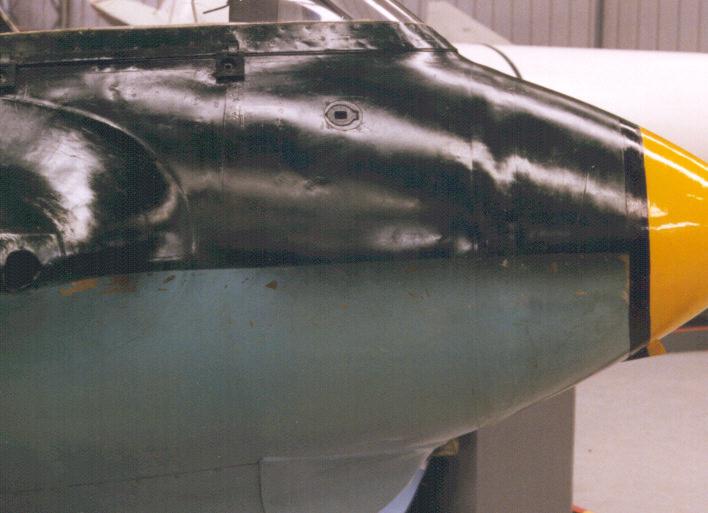 Close-up of the right front fuselage. The modified canopy hinges can be seen, as well as the oxygen filling point just below the canopy. The remains of the soft edge of the old camouflage are peeking out below the hard edge of the new camouflage.
