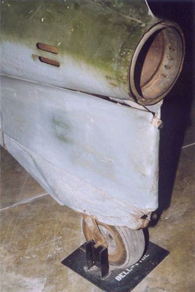 Detail view of the exhaust and tail wheel area. Note the C-Stoff dump pipe underneath the rocket exhaust. It vented the C-Stoff used for cooling the combustion chamber in case of overpressure. The cooling slots are also clearly shown. The (non-structural) sheet metal over the tail wheel appears to have detached from the fuselage.