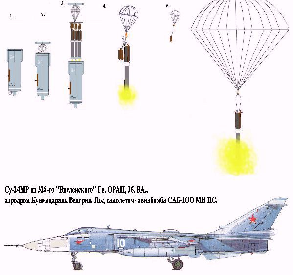 A drawing of the lighting bombs as used by Kunmadaras Fencers (the so-called Stalin's candle). The bomb contains 7 PS-13017-72 type parachutes, below which the magnesium flare burns. The drawing also shows an accurate drawing of Su 24MR sidenumber 10 of the 328. GvORAP.