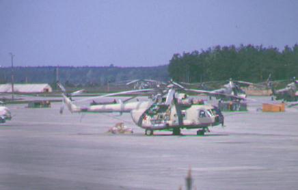 A view of the huge Templin ramp filled with Hips and Hinds. Mi 8MT 'Blue 34' has its engine bays opened. This Hip later attended the second Finow air show. The blastwall of the the flightline can be seen in the upper left corner.
