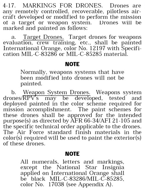 USAF Tech Order 1-1-4 'Exterior finishes, insignia and markings applicable to USAF aircraft' from 1978, section 4-17, specifies 'international orange, Color No 12197' for target drones.