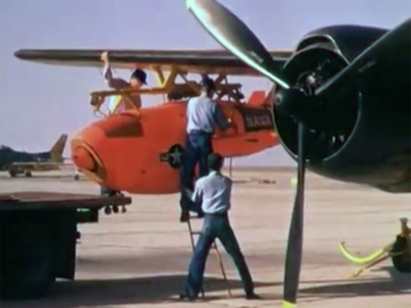 Overpainted KDA, with Insignia Red remaining on the electronics hatch in the rear fuselage, and the battery access panel on the forward fuselage. Screenshot from 'F-2442 Ryan Firebee Launch from Douglas A-26 Invader' |