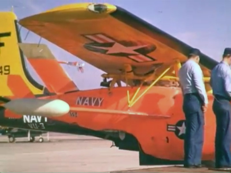 Overpainted KDA, with Insignia Red remaining behind 'Navy' and serial number markings. This picture suggests yellow-orange to me. Screenshot from 'F-2442 Ryan Firebee Launch from Douglas A-26 Invader' |