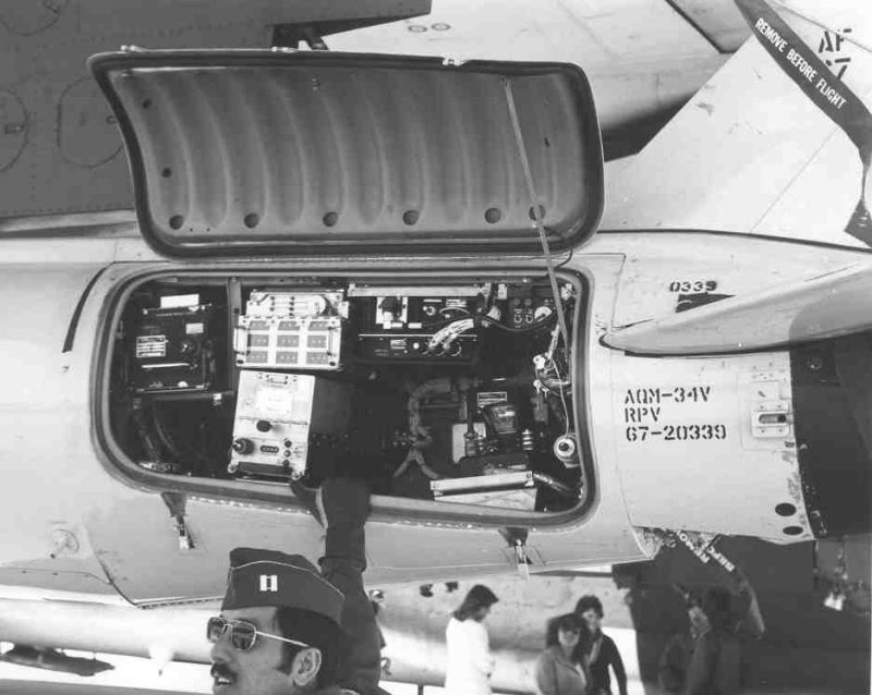 Unique view of the rear electronics compartment. The hatch itself locks with three latches. The purpose of the small bracket just right of the data block is unknown. To the left and below the hatch appears to be a drain tube. Also visible there is the strong kink in the lower fuselage contour.