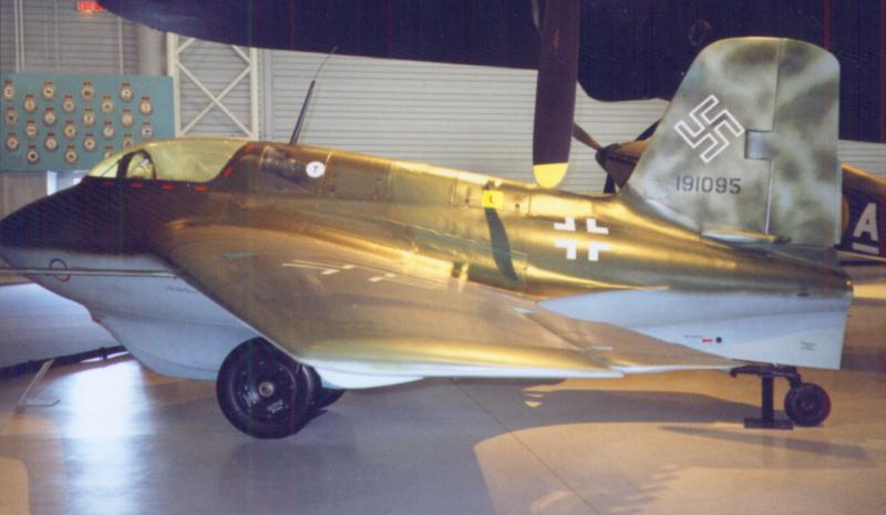Straight view from the left side, looking over the wing. The skid is completely retracted, and the tail wheel has compressed completely too. This makes the aircraft's attitude a little different from that of an operational Komet, which has the skid a notch lowered and the tail up in the air.