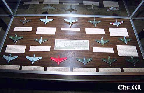 The display cabinet filled with a collection of 1/72 Komet models. If I count correctly it contains two Me 163A's, ten Me 163B's in all kinds of camouflages, two Me 263's (or perhaps one Me 263 and one Me 163D), and a Japanese J8M1 Shusui.
