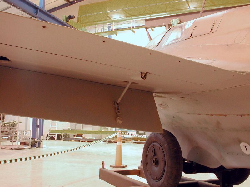 View of the flap under the wing, and the trim surface at the wing's trailing edge. Note the ventilation holes in the fabric covered trim surface. The lower center fuselage seems to have been painted with transparent mottles.