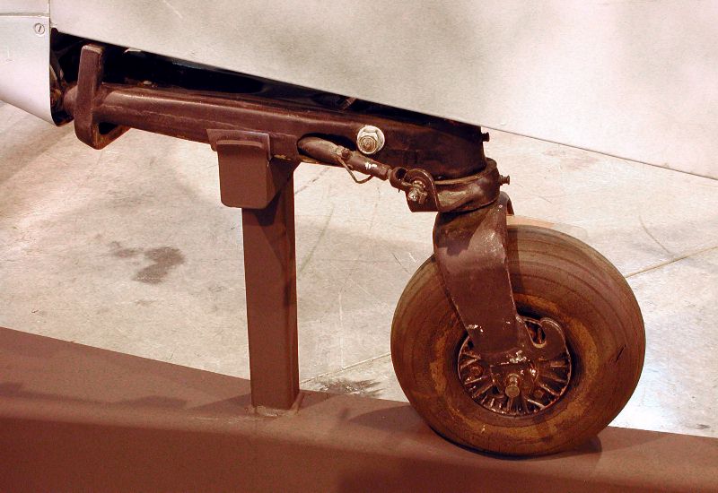 Great detail view of the tail wheel. Note the tail wheel steering arm exiting from the triangular frame. This steering system could be locked before take-off on the other side.