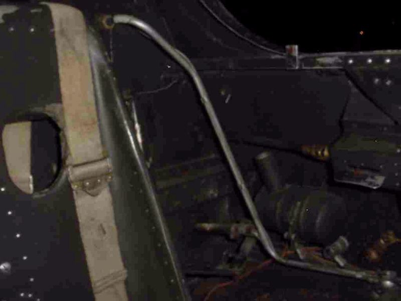 View of the rear left corner of the cockpit, showing part of the seat with a shoulder belt, a T-Stoff line and a small tank.