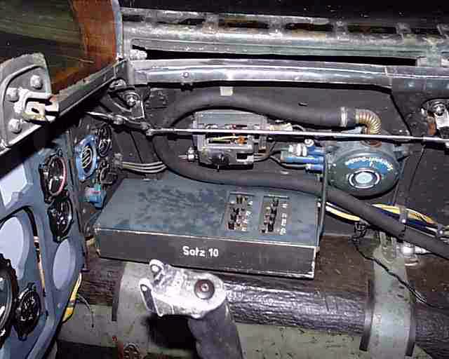 Front right corner of the cockpit, showing the T-Stoff tank with both horizontal and vertical straps, oxygen system and the electrics box.