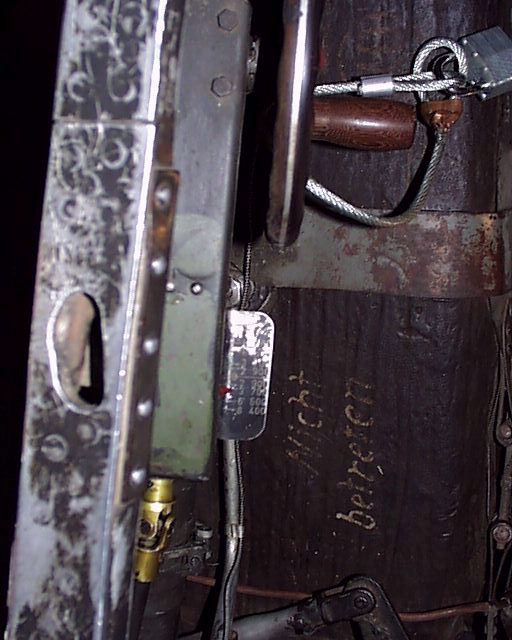 Top view of the left canopy sill and the trim wheel. 'Nicht betreten' (no step) marking on the T-Stoff tank.