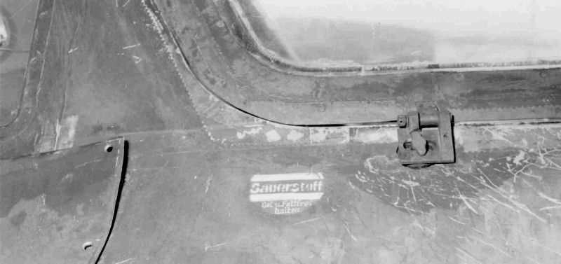 Close-up of the canopy. Note the simple canopy hinge release mechanism: by rotating the T-shaped retaining pin from inside the cockpit, the hinge is released. Also of note are the remains of the tape that sealed the canopy during its years of storage. Compare this with the areas of red oxide primer showing through in the color photos. The 'Sauerstoff - Oel u. Fettfrei halten' marking identifies the oxygen filling point inside the cockpit.