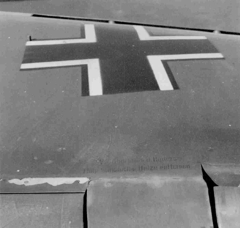 View of the right wing, showing the 'flaps down' indicator pin sticking out. The wing cross is clearly aligned with the aircraft's axis (as per Luftwaffe painting instructions), and not the wing sweep angle. At the bottom of the photo, a stencil is seen, reading something like 'Vor .... d. Ruders, ....... entfernen'. This stencil was not known to be applied to Komets.