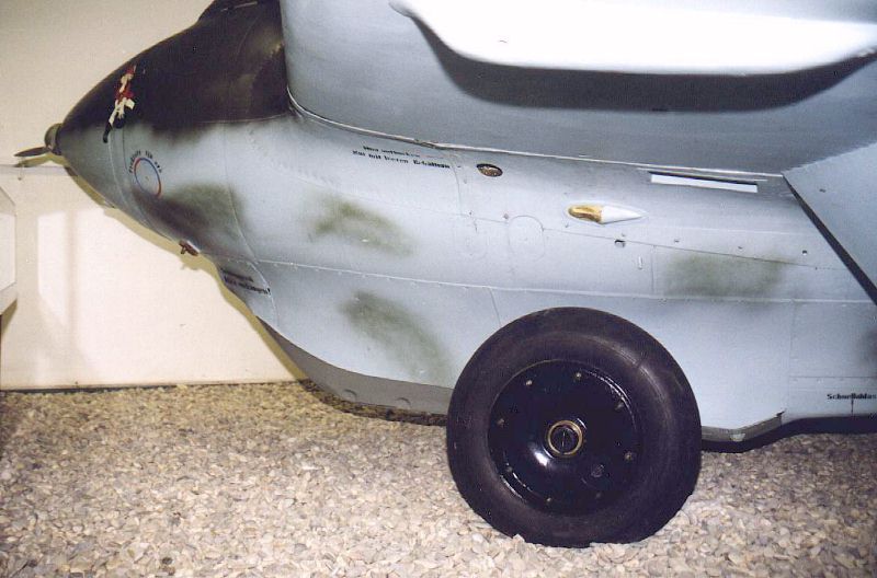 Nice view of the lower center fuselage. The skid is completely retracted and appears to be painted in RLM 02 Grau primer. On the right the lowered flap can be just be seen. A couple of vague mottles can also be seen op the lower fuselage.