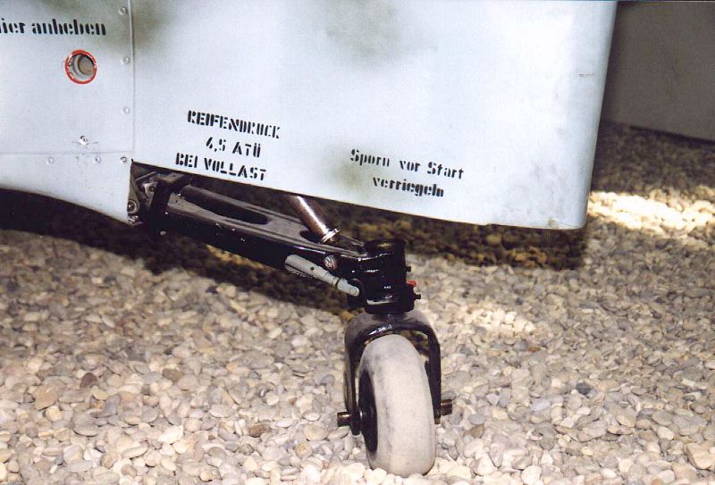 Close-up of the tail wheel, again showing the good condition of this example. The stenciling font is different from the font used on WW2 Komets.