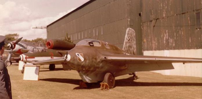 A very impressive line-up of FW 190, He 162 and Me 163. The flaps are down as usual, and the small hatch in the canopy has some cover (?) fitted. The 'spinner' of the generator prop is missing.