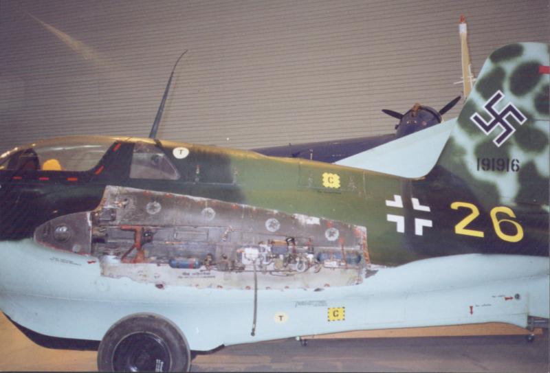 Side view showing the gun bay in good detail. Compared to the pictures of the Duxford Komet restoration, much is missing from the gun bay, most notably the MK 108 cannon itself. The canopy is surrounded with a dashed red line (like 191095), the significancy of which escapes me.
