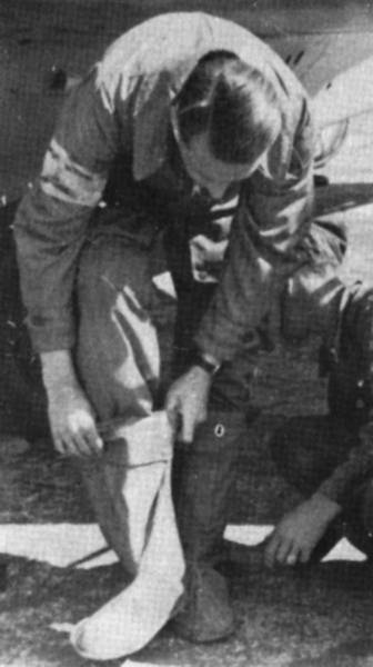 A pilot dressed in the protective overall puts on protective 'shoes'. Note the armband being worn upside down!
