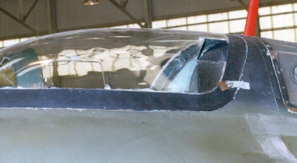 Detail view of the canopy. It shows the original ventilation window at the front; the hinged window itself has rotated almost 180 degrees and is hidden behind the canopy frame. The square cut out near the rear edge of the canopy and the padlock are not original. The lower part of the red-painted antenna is also visible. Some of the fabric tape used to attach the wing root panels can be seen in the right-hand corner.