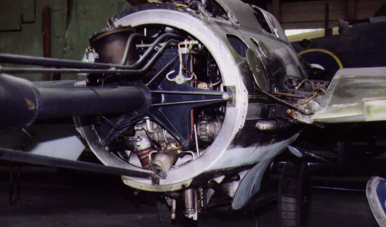 Low rear view of rocket engine mounting and front fuselage. Many engine related systems are visible.