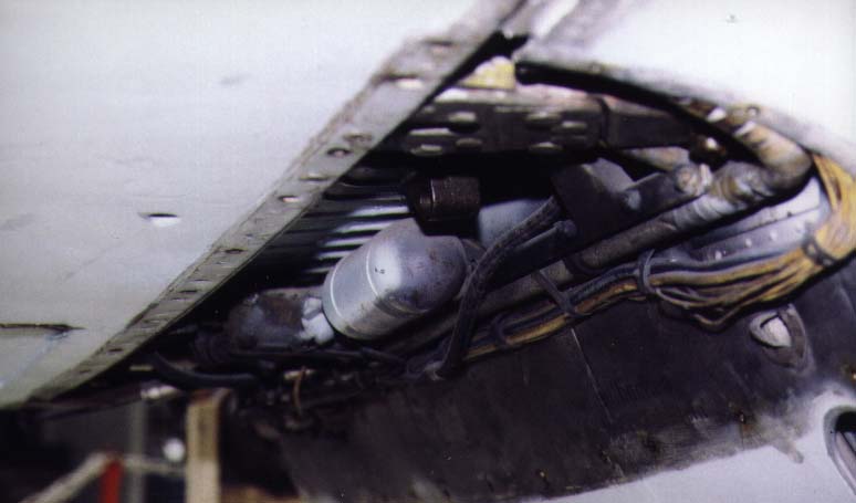 Underside view of right wing root, looking aft. All panels are removed, showing lots of systems detail.