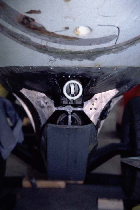 Head-on view of the landing skid in retracted position. Just above the skid the attachment point for the tow-line is visible.