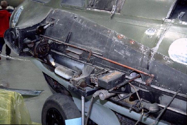 General view of the gun bay while the wing has been removed, prior to restoration. Many mechanical, electrical and hydraulic systems can be seen.