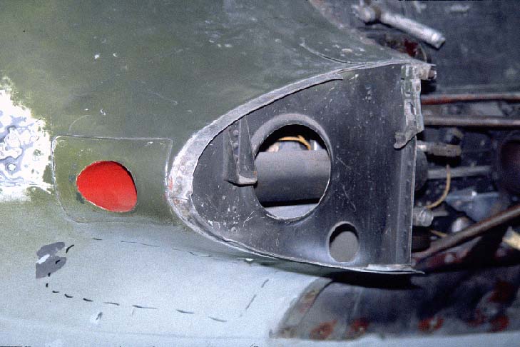 Detail view of the wing root leading edge, showing the blast tube of the cannon.