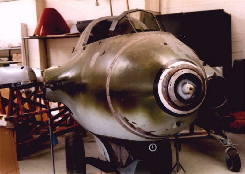 Front fuselage with the nose cone attached. It is riding on the dolly. The rear fuselage is parked on the right.