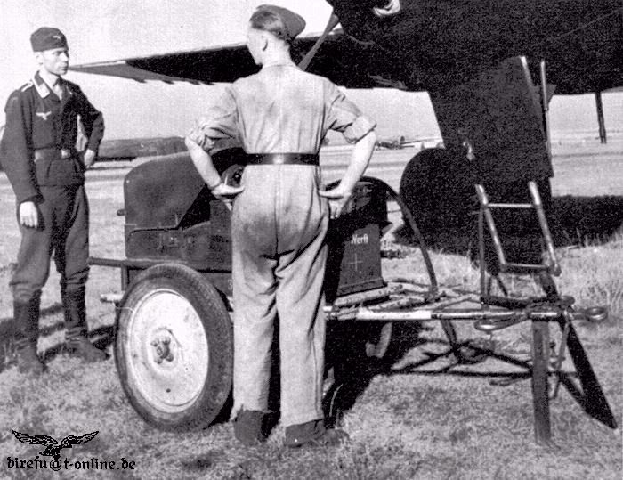 An Anlasswagen parked in front of a Heinkel 177 bomber. Note the text 'Werft' (maintenance hangar) on the front side, and the light color of the wheels compared to the rest of the cart.