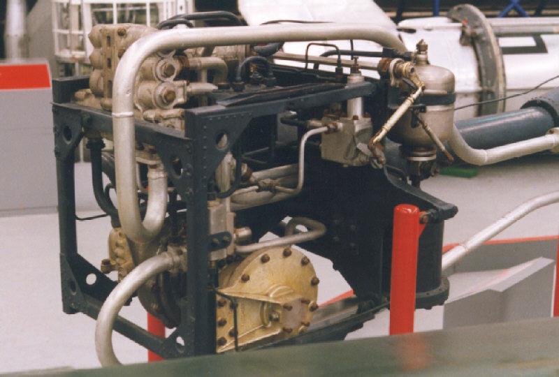 Left hand view of the Walter HWK109-509A-2 test article. Note the thick aluminium pipes running to and from the combustion chamber. They extends beyond the square 'systems box', which makes it impossible to install the engine in a Me 163B airframe. Note the differences with the A-1 model, as for example shown on the Duxford restoration photos. This engine has no gearbox covering most of the left side of the square 'systems box', and the prominent cilindrical steam generator has been downsized and moved downwards.