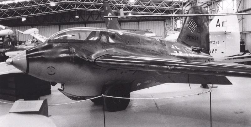 The East Fortune Komet in 1990. It is interesting to compare with the 1997 photographs; here it still has a largely matt paint (gloss in 1997) and it has large mottles on the vertical tail. Note also the soft edge between the camouflage colours on the nose; in 1997 this has become a hard-edged demarcation. Some panels are missing, such as the one between the towing connection and the forward end of the skid, one of the panels of the landing skid fairing, and the one covering the rudder actuation pushrod. The pitot tube on the left wing is missing.