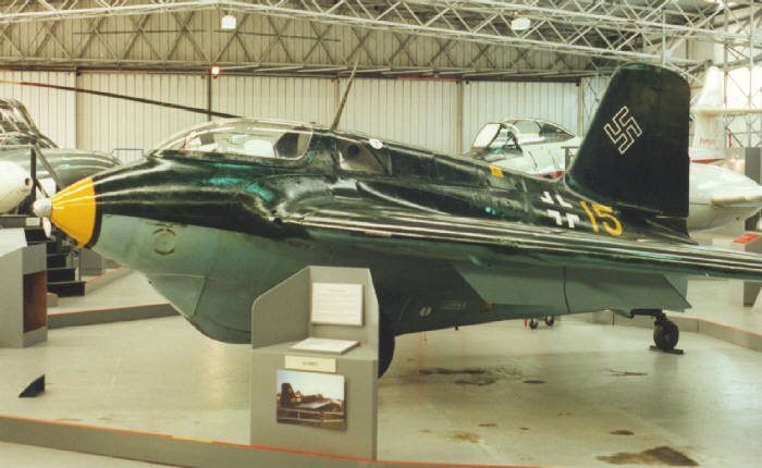The Komet in 1997. The aircraft appears to have been painted over; the appearance is now gloss, and the tail is painted in the same colour as the fuselage. The missing panels have been reconstructed, and a new pitot tube and boom have been added.