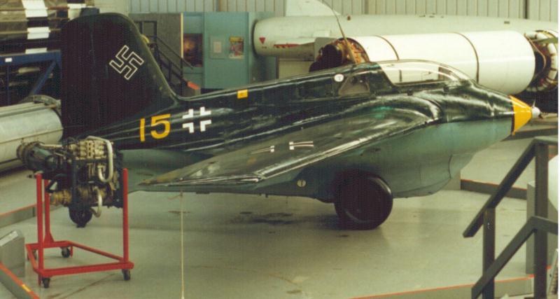 Right side view. Like all museum Komets, the attitude is a little more nose-up than that of wartime Komets. This is caused by the deflated tail gear spring/damper.