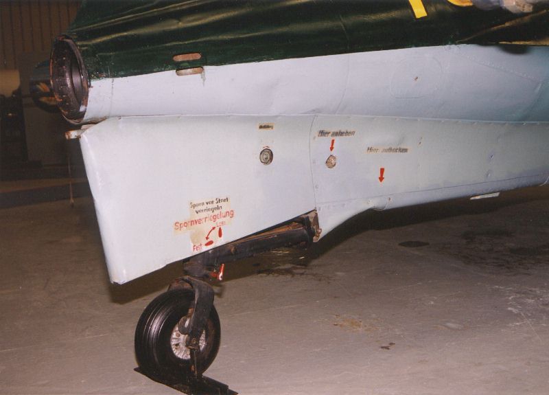 Nice view of the tail wheel and lower rear fuselage. The dual slots near the combustion chamber appear to have been the final configuration for cooling air entrance. Although the fuselage has been overpainted, the original stencilling has been conserved. The exit of the overflow pipe for C-Stoff cooling the combustion chamber is also interesting; the cut-out in the tail wheel fairing differs between Komets of different production batches.