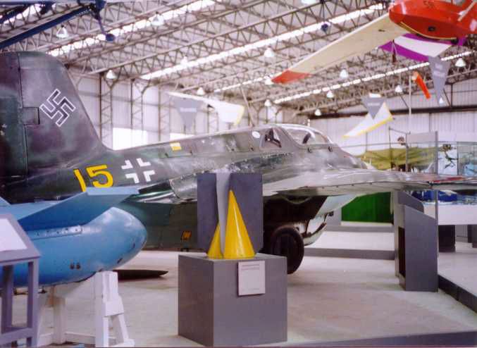 Nice view of the Komet on display in the museum. The glossness of the trailing edge wing root fillet suggests this is a replacement part. Camouflage colors appear to be purplish brown and dark green.