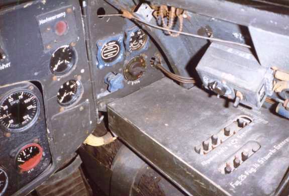 Great view of the right forward corner of the cockpit, showing part of the instrument panel and the electrical switch box. The left upper corner of the picture shows a 'Machwarnung' (Mach warning) instrument, that is not covered in the 1944 operating manual. The rear row of switches of the electrical switch box controls FuG 25 (IFF system, underwing antenna), FuG 16 (radio and ground control, Morane antenna on the spine), Staurohr (pitot tube heating) and a fourth one.