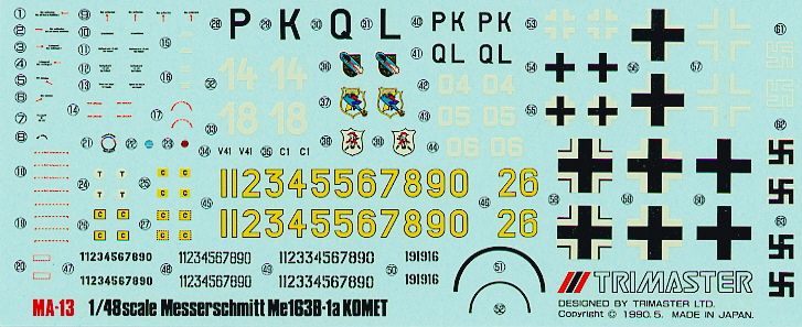 The Trimaster decal sheet is much more extensive than those of the Dragon and Revell-Germany reissues. It has decals for three EK16 Komets ('White 04', 'White 05' and 'White 06'), the mottled 'White 14' and 'White 18', Späte's red V41/'PK+QL', and the Canadian museum example 191914 'Yellow 26'. Furthermore it contains extra set of yellow code numbers and three sets of Werknummers. The scan was again provided by Neil Royes.