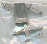 The white metal parts (shown in their plastic bag) consist of a seat, a dolly axle (center), and a three component tail wheel strut.