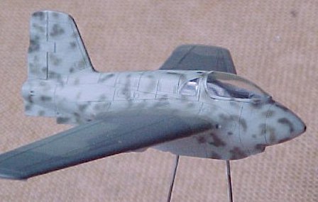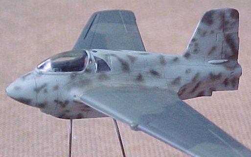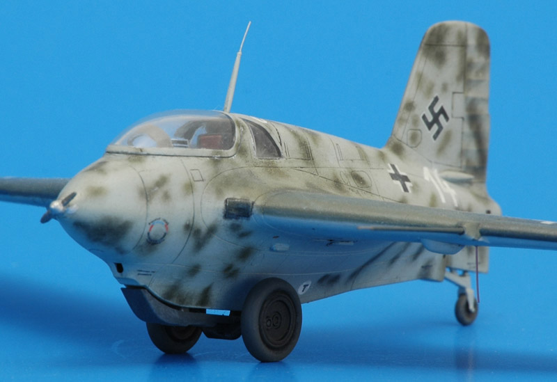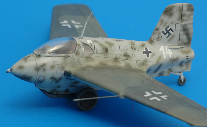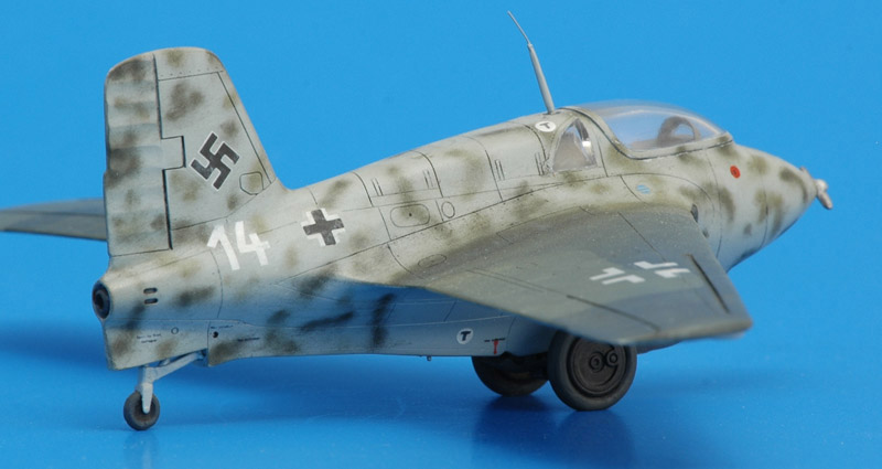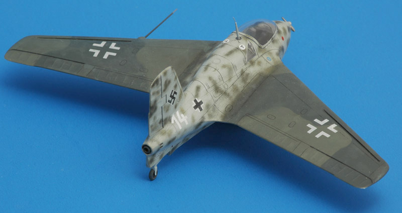 That only left painting the wings. Again I used RLM 70/71 (Model Master II enamels), because I think that 'White 14' is an early Komet, that was painted before the late-war colors RLM 81 and 83 became available. Because I found the contrast between Model Master's 70 and 71 too big, I mixed my own version of RLM 71 from 71 and 70 in a ratio of 2:1. I followed Academy's wing camo pattern, because of a complete lack of better information. Komet wing patterns are a big mystery to me! The transition between the painted wings and mottled fuselage did not look right at this point, so for the third time I used pastels to create a nicer transition.