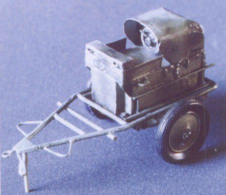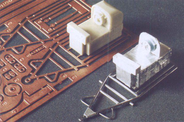 A picture of the photo-etched and resin parts of the Verlinden Anlaßwagen. The tube frame of the cart is represented by flat photo-etched part. The part on the right is a scratch built replacement.