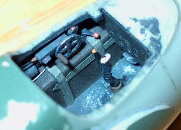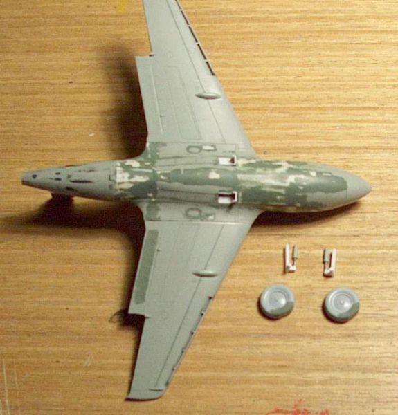 This lower view shows even more filling and sanding. Also shown is the new main landing gear. Note the wheel wells in the fuselage, the scratch built legs, and the wheels made from the Heller Scheuch-Schlepper.