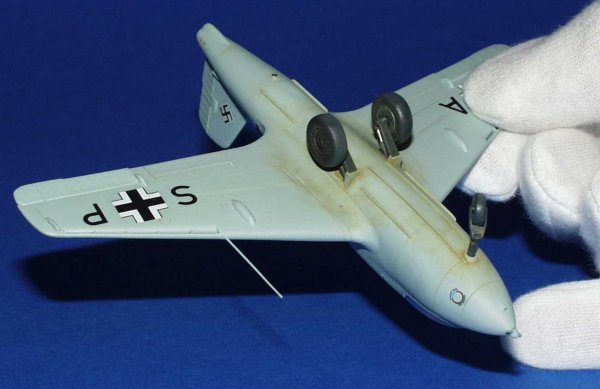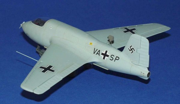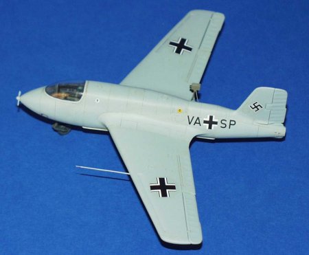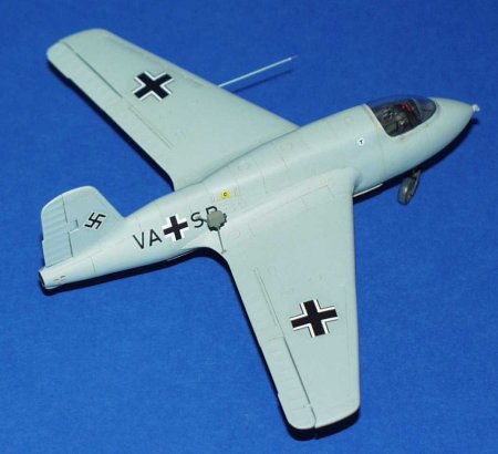The model was painted RLM76 using Polly S paint. The Stammkennzeichen VA+SP was made by Jimmy and a friend some years ago. They scanned the letters from a book and got them typeset on film. Jimmy's friend screen-printed them on a kind of decal paper. They have no carrier film and conform completely to the curves of the model. The swastikas are from Microscale and the stencils are from Academy's Me 163 decal set.