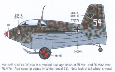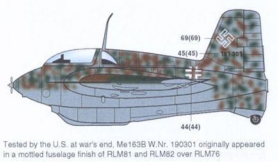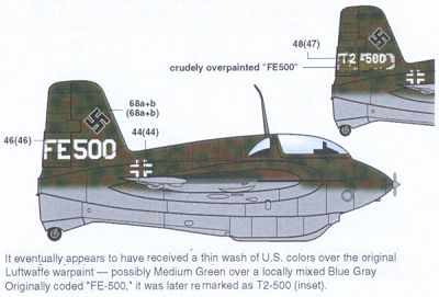 I don't have a dedicated page yet about 'FE500' aka 'T-2-500', but you can view how this Komet looks now at the NASM page. The Aeromaster markings look pretty accurate, but I don't think it had a solid camouflage. It looks to be very densely mottled to me. |
