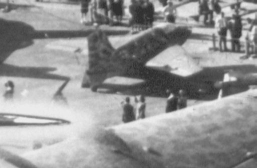 Blow-up of another picture showing the right side. The wing Balkenkreuz can be seen a little better here, but the fuselage mottling is more difficult to see.