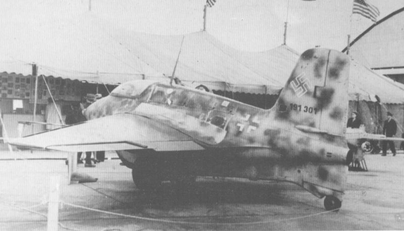 Nice left rear view of 191301. It has no code applied, possible a sign of not having flown operationally. Both Balkenkreuz and swastika are white only. The gun bay panel appears to be in the base color of the fuselage (most likely RLM 76), most likely coming from another Komet. It can be assumed that the Komets were taken apart before shipping. It was also thought that this was a locally manufactured replacement panel (in bare metal), but the colors and the mottles on the rear upper edge suggest a donor part.