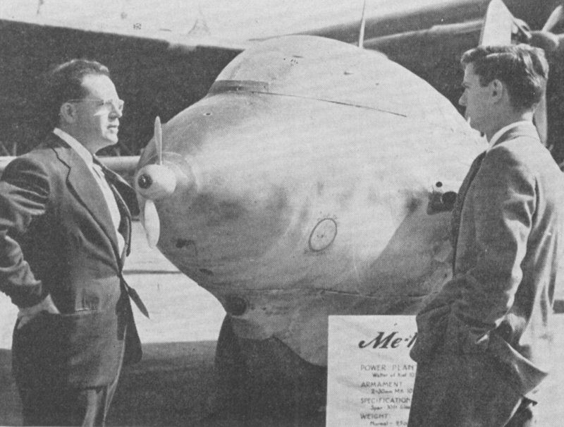 Magazine caption reads: "Discussing design details of Me-163 shown here, are Author Healy (left) and J.V. Balch, ATSC rocket expert. Note generator propeller in craft's armor plate nose, also the retracted belly skid". In the background the Ju 290 is seen again, clearly placing this picture at the Wright Field Air Fair, and identifying the Komet as 191301. Interesting detail is the gun muzzle, not taped over as seen in many other pictures, and the hole just above and inboard of it, used for boresighting. This hole is seldom seen open.