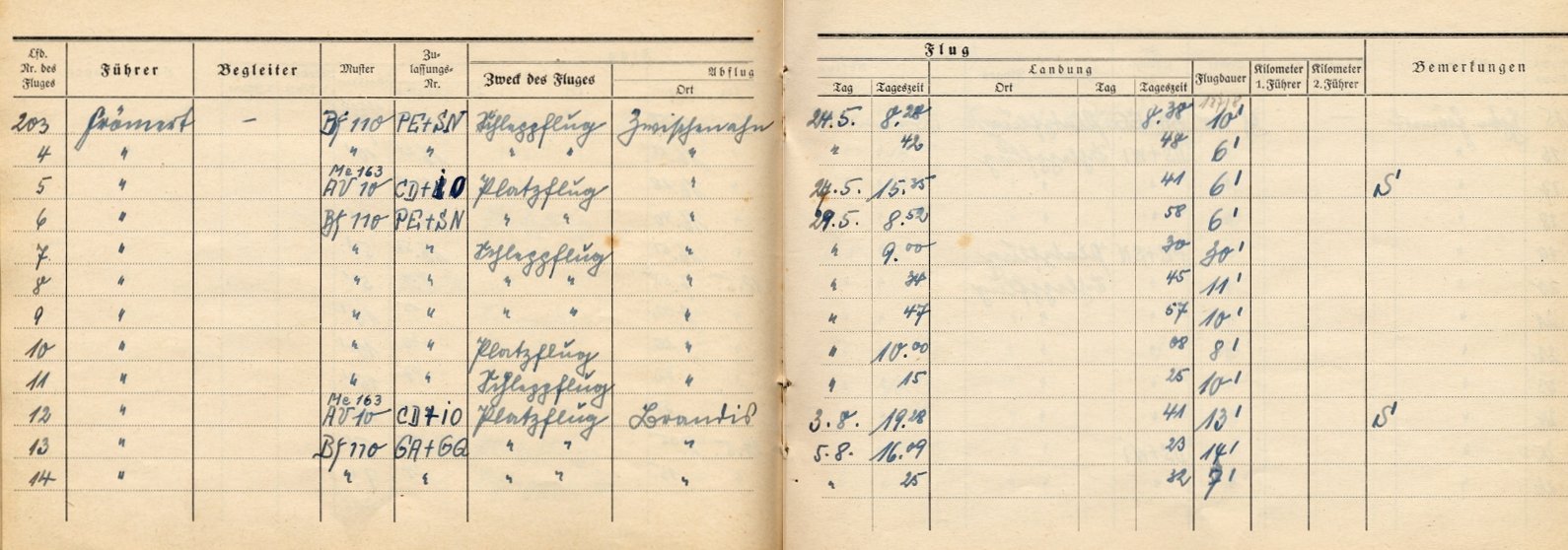 The first page of Hauptmann Herbert Frömert's flight log that shows a Komet entry.