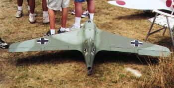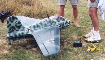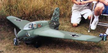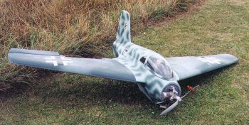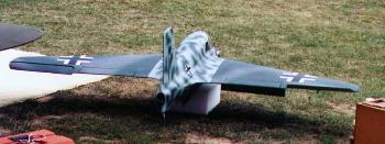 Sal's Komet is powered by a Magnum 1.08 engine. It has a 16 ounce fuel tank. A Futaba Super 7 radio and standard servos are fitted. Sal finished his model with commercial grade flat camo paint. The flight ready aircraft weighs in at 11 pounds. The Komet is very responsive with the elevons. | |||