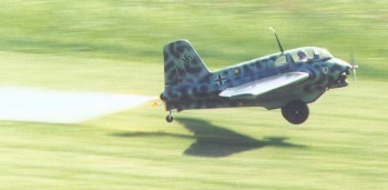 Rich Zwirblis (from Ronkonkoma, NY) also built an 82" wing span model, built using Jim Kiehl plans. Rich modified the plans, so the model has removable wings and flaps (spoilers) under the wing like the real one. You can see them peeking from under the wing in the picture below. The wings and fuselage are sheeted 100 percent with 3/32" balsa and then finished with a Solartex film covering. A two stroke MVV 1.20 engine is installed. | ||
